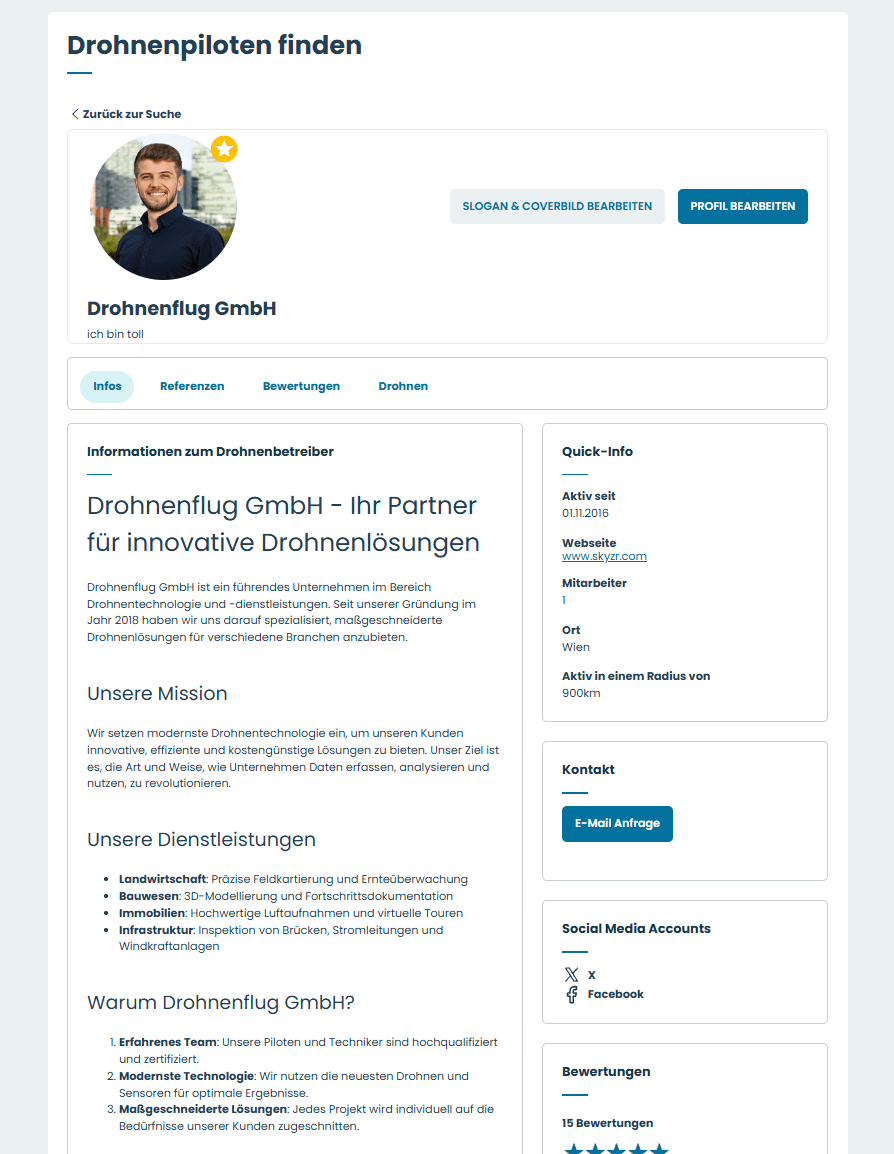 (Unternehmensbeschreibung, Kontaktmöglichkeit, Social Media Accounts, Referenzen, Drohnen, Bewertungen)
