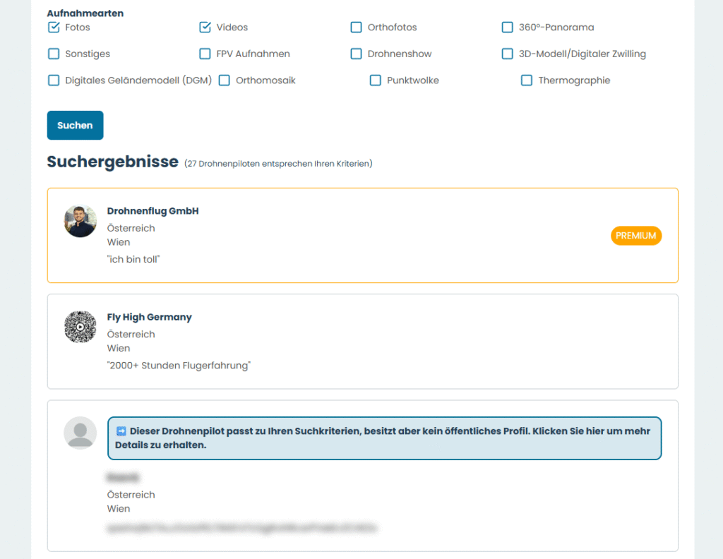 Mit übersichtlichen Filtern können Besucher schnell ihre Suchkriterien einstellen und bekommen passende Drohnenpiloten angezeigt. Vielleicht sogar genau dich.