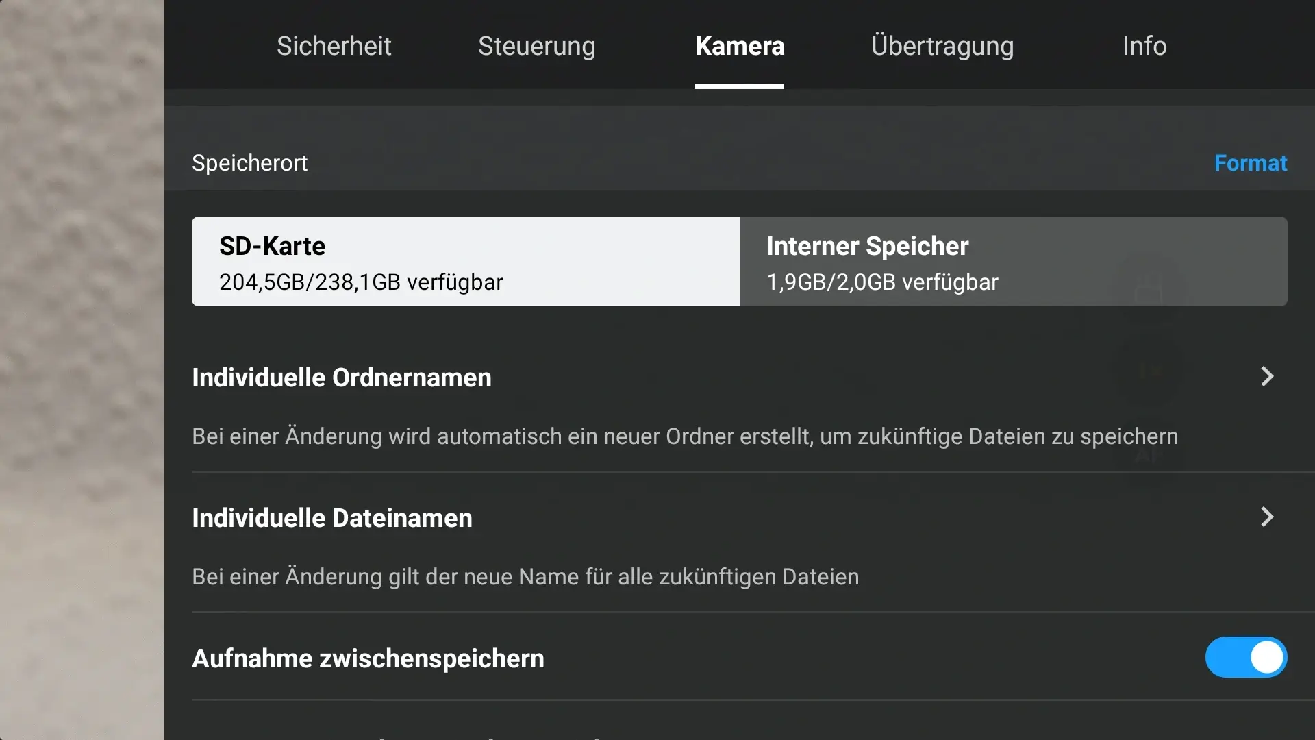 The switch between internal memory and memory card can be set in the respective drone app. For DJI drones, simply navigate in the DJI Fly app in the camera view to Settings -> Camera -> Memory. Here you have the option to switch between internal and external memory.